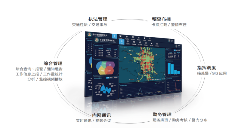 系统整合了当前公安交通管理最新的管理思想和应用理念,集成综合信息查询、 移动执法、接处警与事故处置、移动缉查、勤务考核、交通管理、多媒体指挥调度、移动办公等功能,按照安全等级,为民警、辅警/协警、公众提供多元化的移动执法服务,实现 全业务场景下的“快速发现”、“精准分析”、“精确打击”,是 实现“大情报”、“大指挥”、“大勤务”的重要一环,是“情指勤督”一体化机制下所有信息系统的神经末梢。