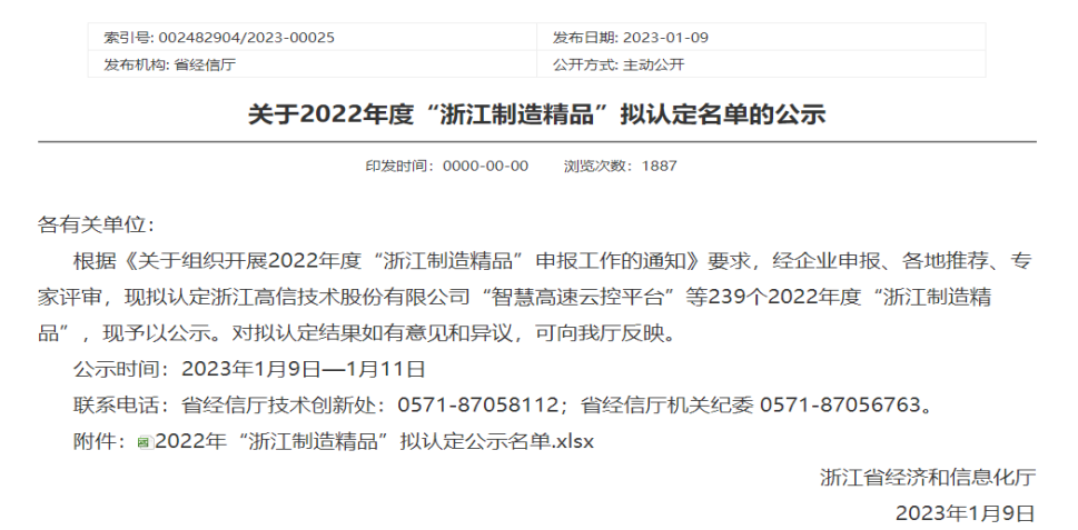 浙江省经济和信息化厅于2023年1月9日公示了2022年度“浙江制造精品”拟认定名单,悟空体育股份有限公司“第五代移动警务终端P999-XD及移动警务系统”名立榜单。