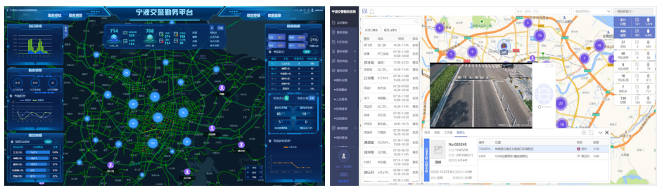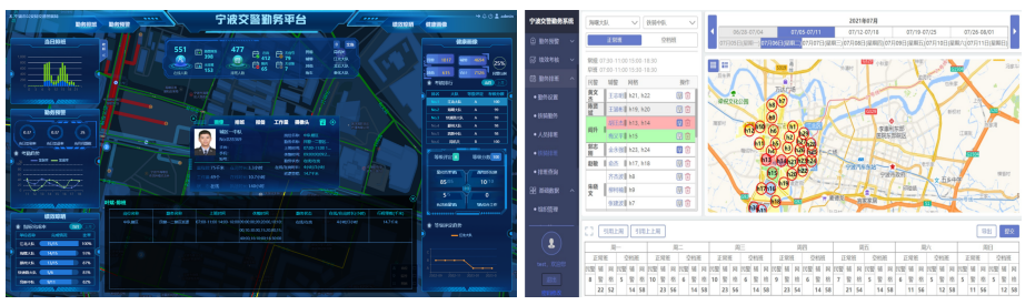 综合勤务管理平台按照营房岗、站点岗、巡逻岗和网格岗四类勤务分配责任区,采取差异化排班模式进行数字化管理;利用警员的对讲机、执法记录仪、警务通、辅警通、警车五个维度的GPS数据,实现对民警、辅警、保安、志愿者全警力的一图展示。平台还采取基础网格、民警网格、铁骑网格等管理手段,摄像头实时视频调取、移动警务执法数据分析、执法记录仪信息检查等多种监督手段,实现对勤务的实时预警和异常研判;通过对量化得分、组织纪律、执法质量、综合工作四个维度进行评价,形成“红橙黄”三色预警,实现对大队、中队、警员三级的绩效考核,通过历史数据分析全方位刻画警员健康画像。
