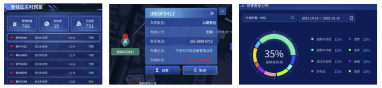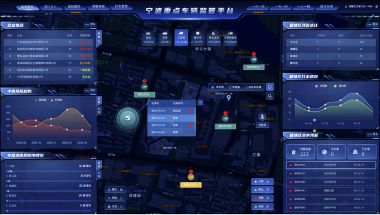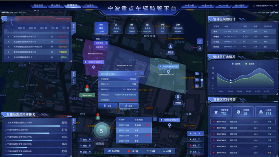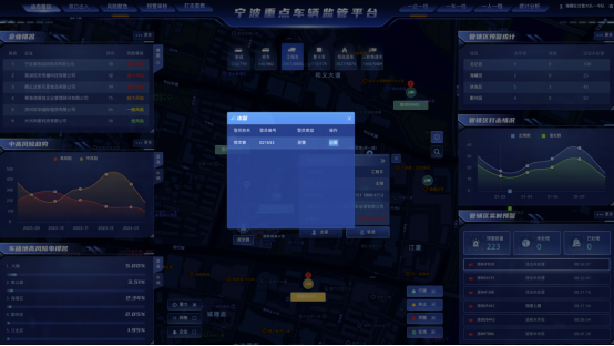 平台围绕“一舱一中心”进行建设,即驾驶舱实战和数据治理中心系统两大部分。驾驶舱实战系统以一张图形式网格化展示各辖区重点车辆的位置信息、状态信息、预警信息等,提供轨迹跟踪、实时预警、警务指派、风险赋色管理和排名、打击宣教、预警审核、一车一档、一企一档、一人一档、事故和违法历史查询以及统计分析等功能,以看板形式展示相关统计信息,如重点车辆和企业的风险趋势统计和风险排名、各个辖区治理情况、重点车辆违法和预警信息、打击宣教历史记录等相关统计数据。
